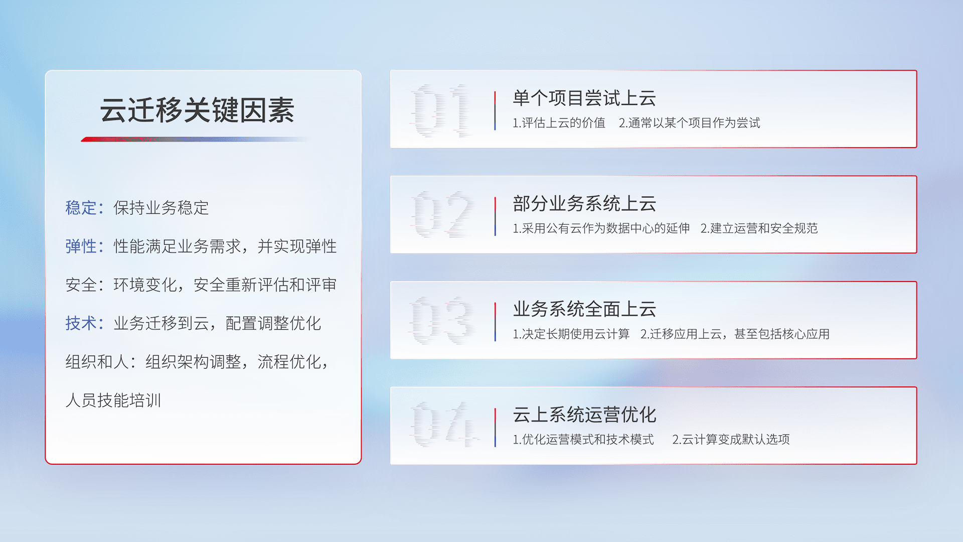 结合实际业务,,从规划设计、、、云平台选型、、、、云原生改造、、、数据迁移、、集成交付,,,迁移全过程为客户识别最佳上云路径,,,,做好风险识别管理,,,设计网络架构、、身份权限、、、、安全审计合规、、操作审计、、、、日志审计、、监控告警策略、、、、多站点容灾设计等,,对云上基础设施进行整体规划,,提升IT治理水平,,以满足弹性、、高可用、、、高性能的需求。。